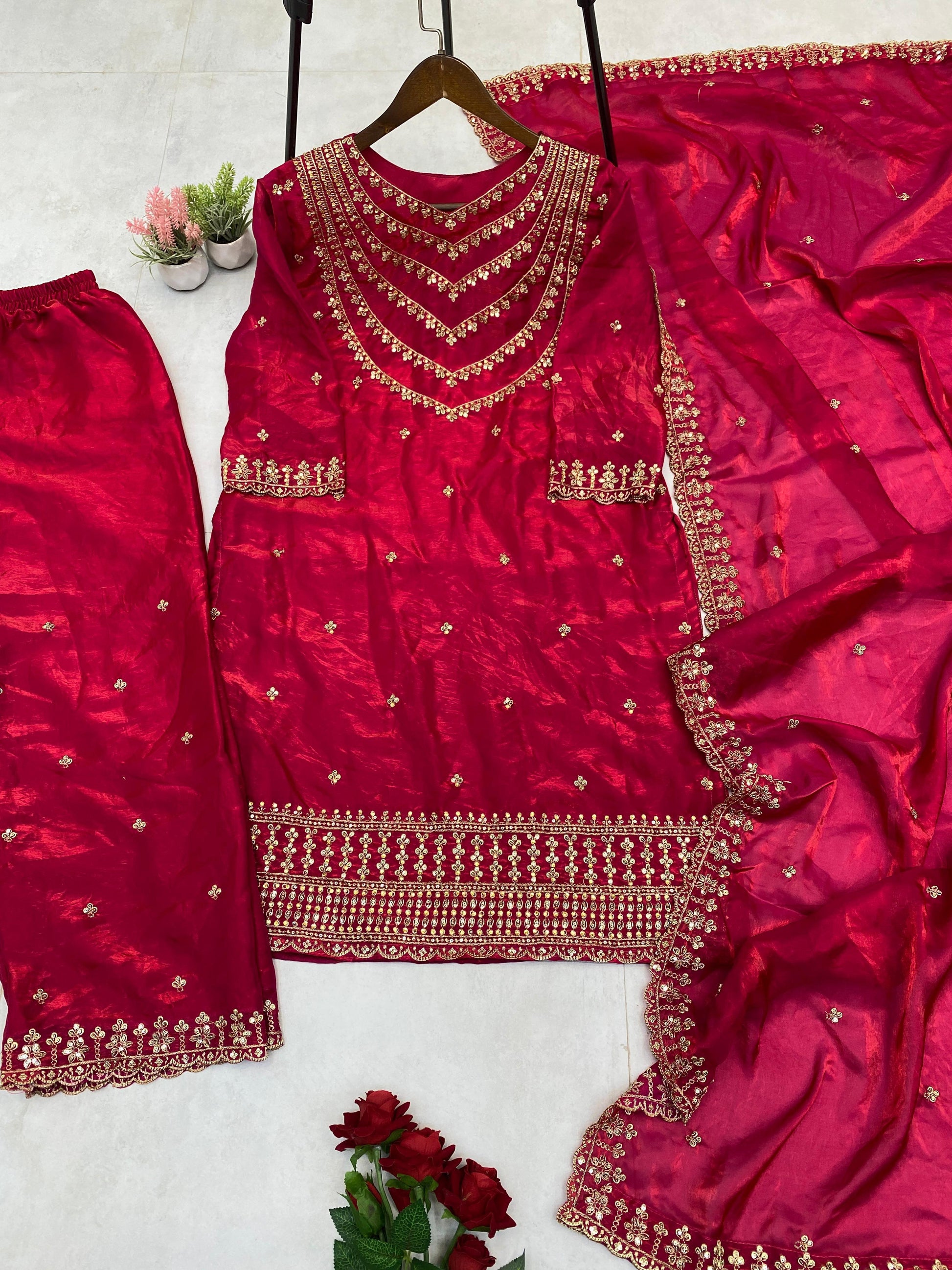 DESIGNER WEAR EXCLUSIVE FENDI SILK FABRIC SEQUENCE EMBROIDERED TOP AND PANT WITH DUPATTA FABRIC DETAILS:-